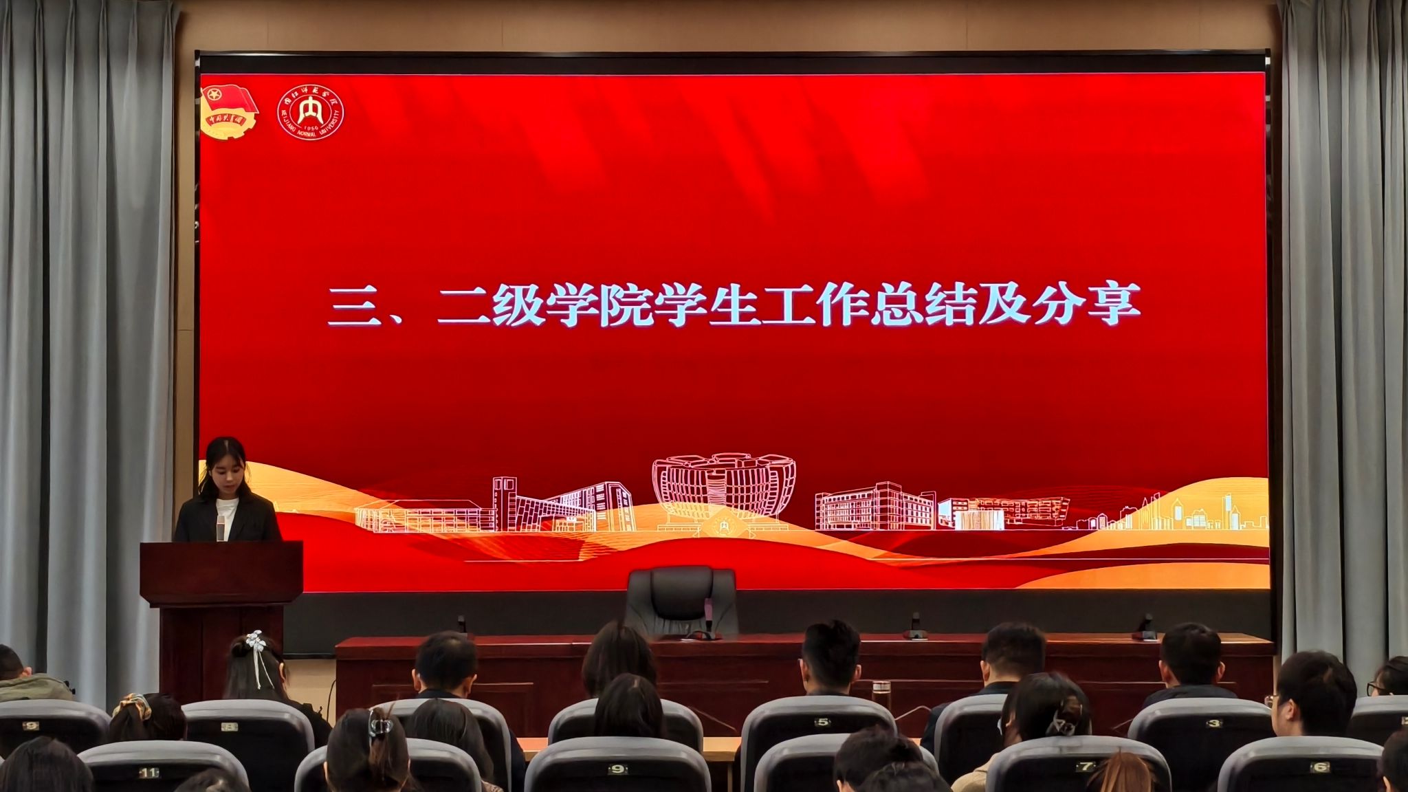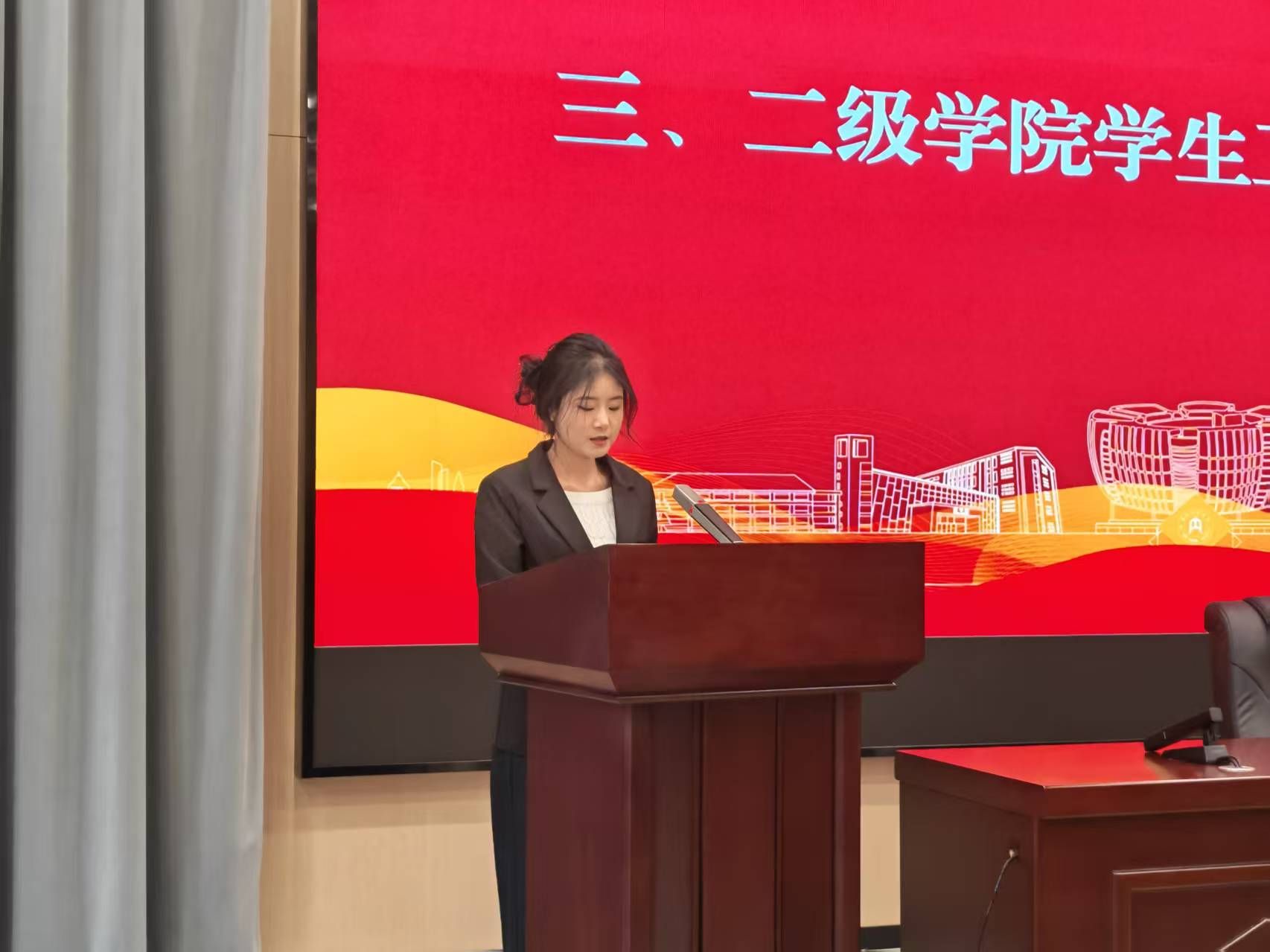 会上,校院两级学生会围绕思想引领、校园文化、权益服务等方面阶段性工作成效和经验做法进行了工作汇报。校学生会执行主席蒋雨以“美育+思政”融合育人为主题,分享调研成果与实践规划,生动展现我校以美育为载体、深化思政教育的创新探索与实践成效。团委素质拓展科科长陈怡君围绕大学生综合素质A级证书的申报标准、评价体系及实践路径开展专题培训,为学生干部提升综合素质、强化履职能力提供精准指导。