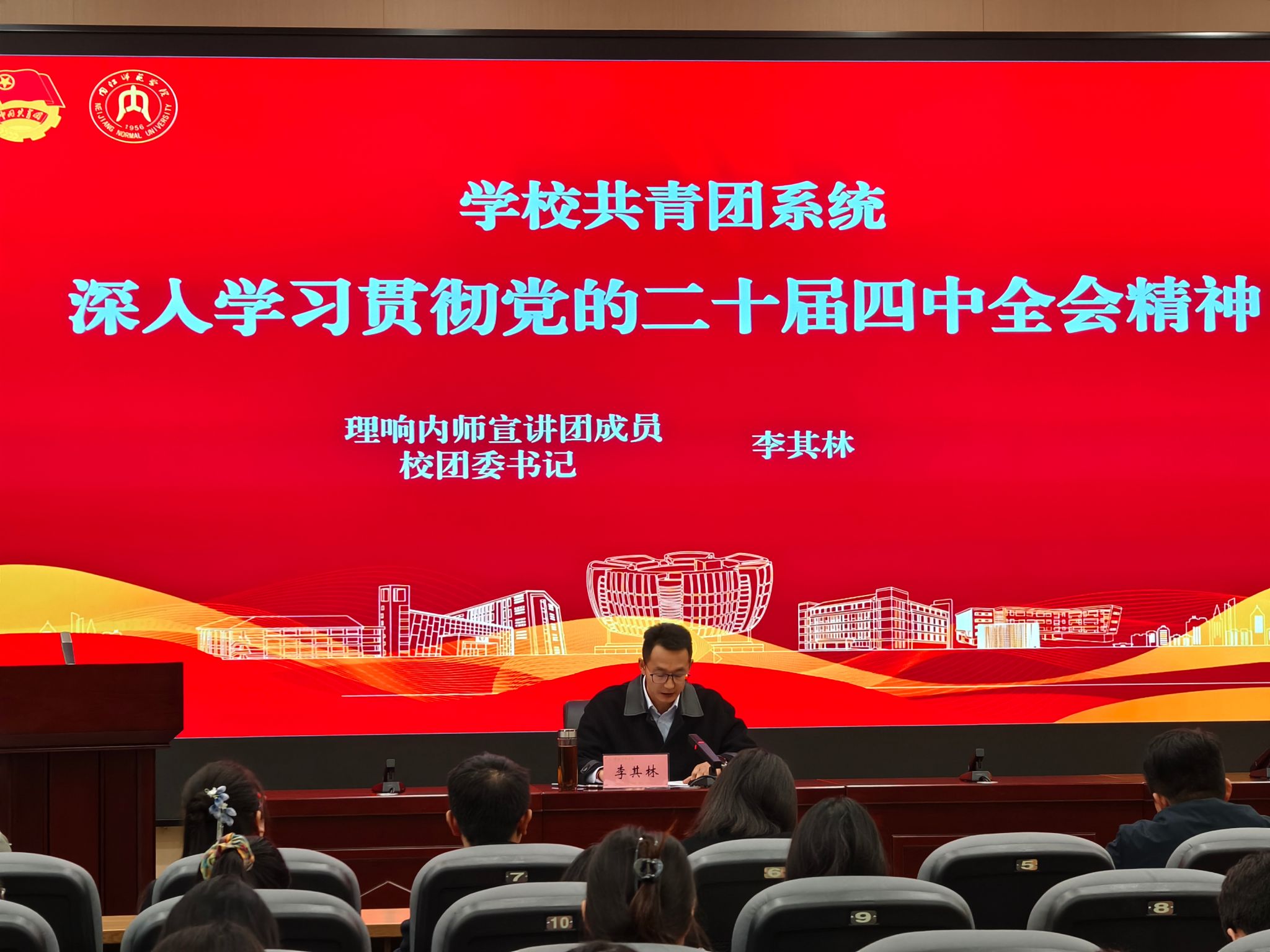 为深入学习贯彻党的二十届四中全会精神,推动全会精神在内师共青团系统落地生根,11月27日下午4点,内江师范学院共青团系统党的二十届四中全会精神宣讲会在学校小报告厅召开,校团委书记李其林作专题宣讲。