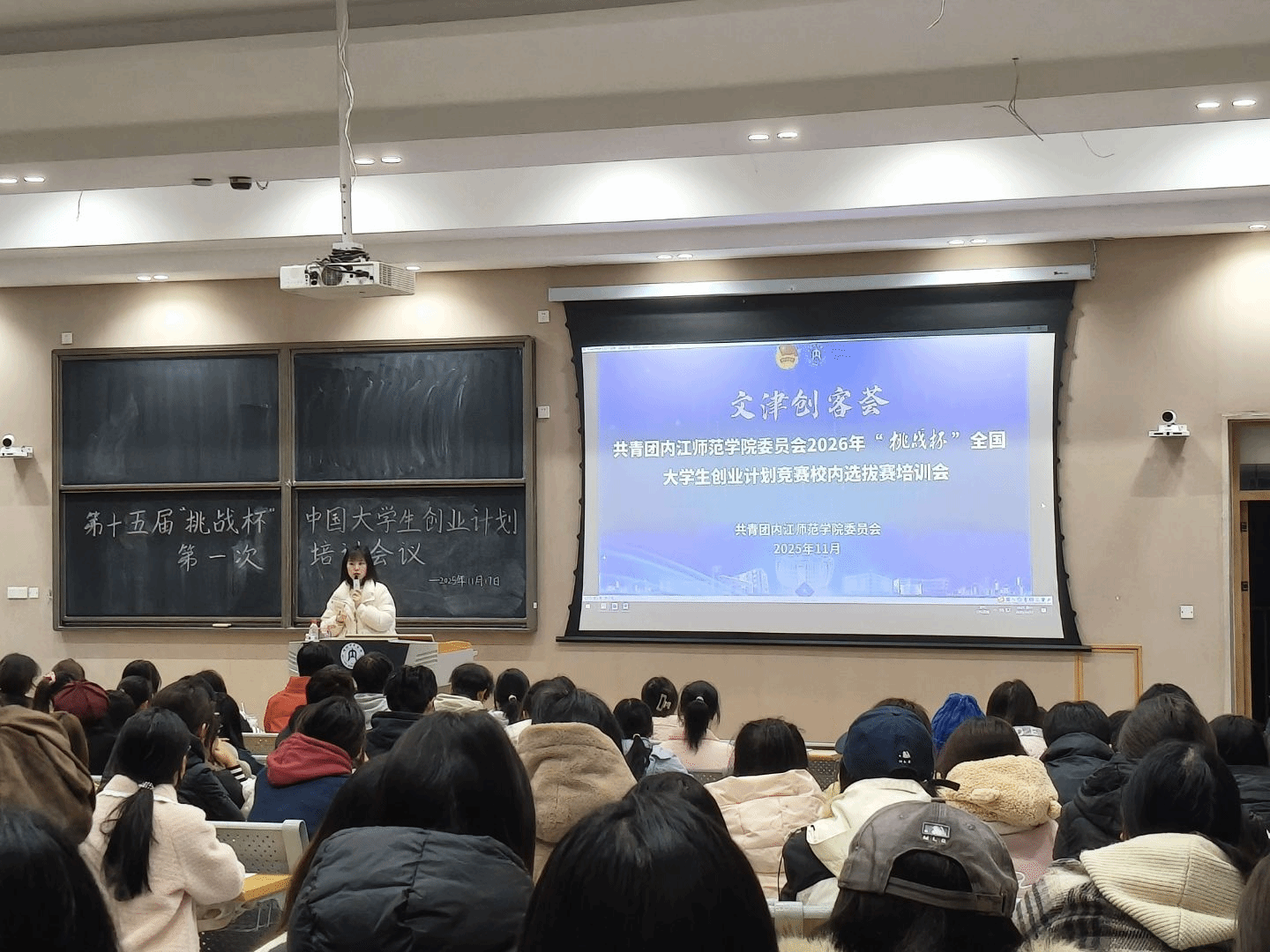 近日,内江师范学院连续举办两场2026年“挑战杯”全国大学生创业计划竞赛校内培训会,分别于11月17日晚和11月21日下午顺利举行。系列培训由校团委素质拓展科科长陈怡君老师和地理与测绘科学学院副教授刘小波老师主讲,围绕赛事安排、选题策略、团队组建等核心环节提供系统指导,标志着学校新一届“挑战杯”备赛工作全面启动。