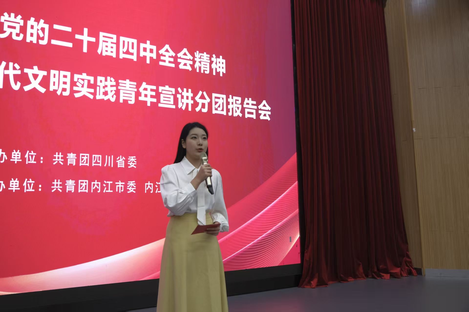 宣讲会上,刘宇超、谢枫艳、谭淋方三位宣讲员依次作专题宣讲。刘宇超以微视频《高质量发展的五年》开篇,回顾“十四五”时期我国发展成就,阐释“幸福是奋斗出来的”深刻内涵,结合“十五五”规划制定过程解读我国制度优势,鼓励青年将国家蓝图融入个人奋斗实践;谢枫艳围绕文化繁荣与区域发展两大主题,结合哪吒、王者荣耀等文化案例,解读四川在文化产业与区域协调方面的实践路径,号召青年以创意助力文化强省建设;谭淋方以“当神话照进现实”为题,通过嫦娥探月、低空经济等生动案例,系统阐述现代化产业体系与科技自立自强的战略部署,激励青年积极投身创新发展浪潮。随后,谢枫艳再次登台,以“青年与四川发展同行”为主题,重点解读党的二十届四中全会关于区域协调发展与共同富裕的决策部署。她结合成渝地区双城经济圈、宜宾航运发展等实例,展现四川实践成效与农业农村现代化进程,并号召青年在推动区域协调发展中贡献青春力量。