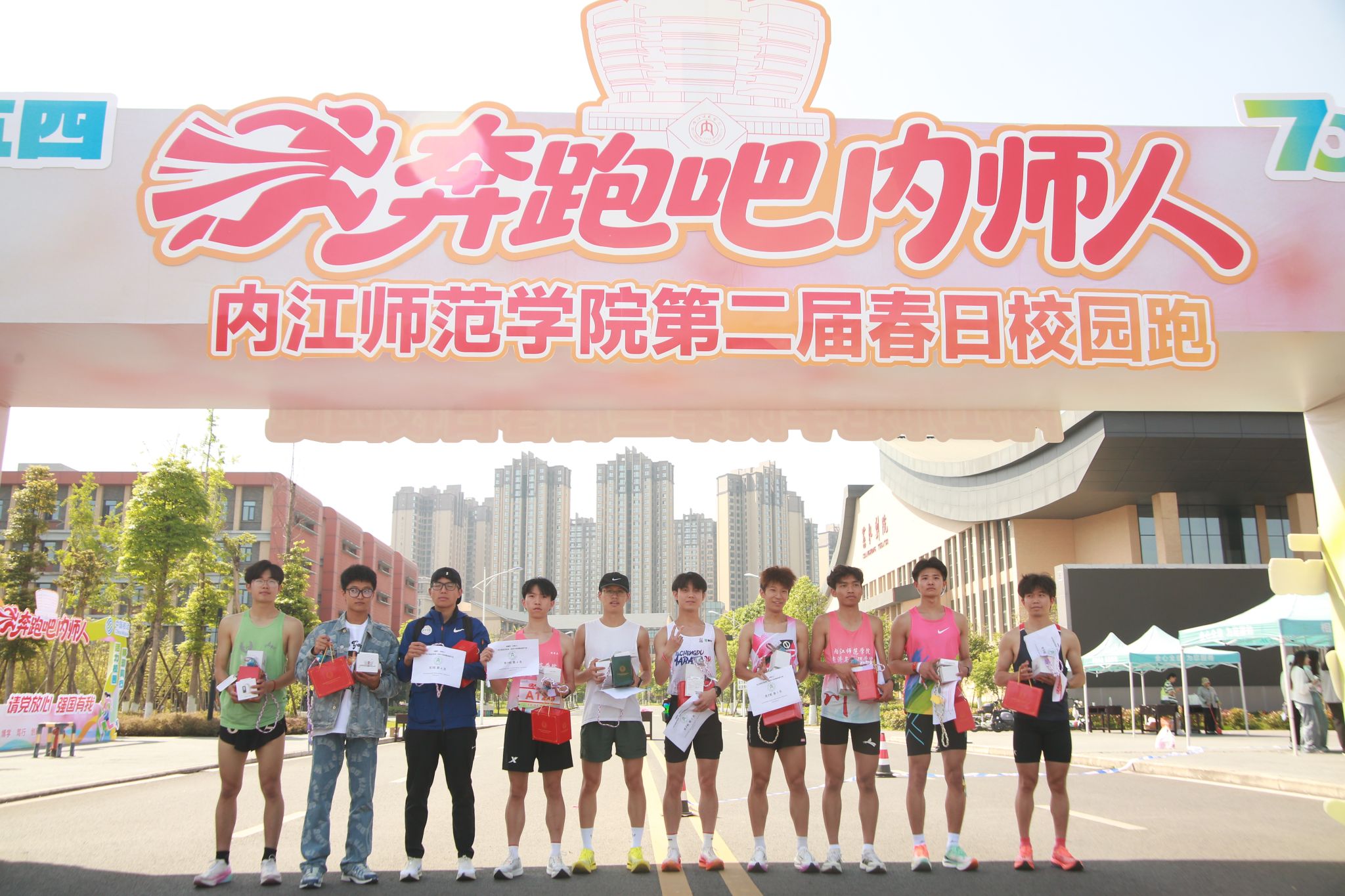 热身结束后,党委常委、宣传部部长、统战部部长陈湘发令开赛。参赛选手精神饱满、步伐坚定,完成全长8公里的校园环跑赛程,充分展现了内师学子锐意进取、昂扬向上的青春风貌。经过1个多小时的激烈角逐,男子组、女子组分别评选出前45名优胜者并现场颁奖。