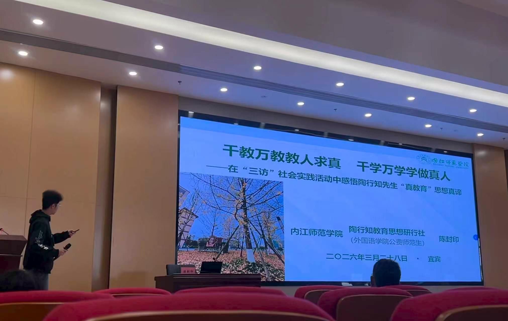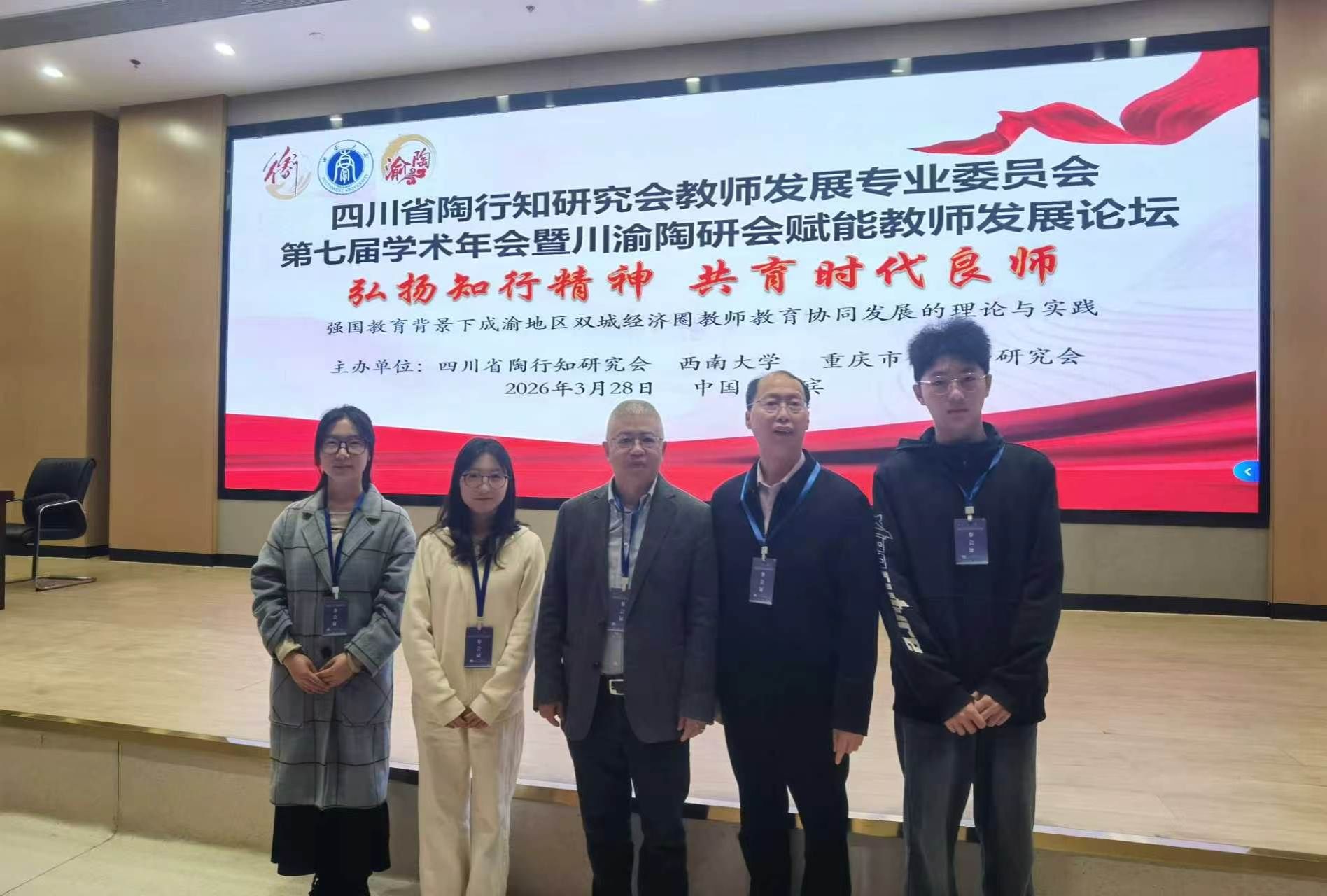 2026年3月27日至29日,“四川省陶行知研究会教师发展专业委员会第七届学术年会暨川渝陶研会赋能教师发展论坛”在西南大学宜宾研究院举行。我校陶行知教育思想研行社(简称“陶研社”)在社团指导教师庞超教授带领下参会,会长蒋婷婷、团支书唐毓同学当选为四川省陶行知研究会教师发展专业委员会理事,来自外国语学院2025级的公费师范生会员同学陈封印在大会上发表主题演讲,展现了我校学生社团的学识素养与精神风貌。